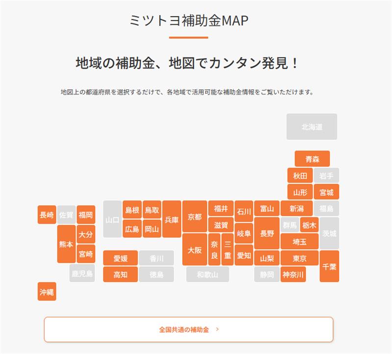 「ミツトヨ補助金ポータル」公開のご案内 サポート・サービス 2025年06月23日 全国どこでも使えるものから市区町村ごとに使えるものまで、日本全国のミツトヨで使える補助金をまとめました。 補助金の情報は随時更新をしています。 ぜひご活用ください。 ミツトヨ補助金ポータル
