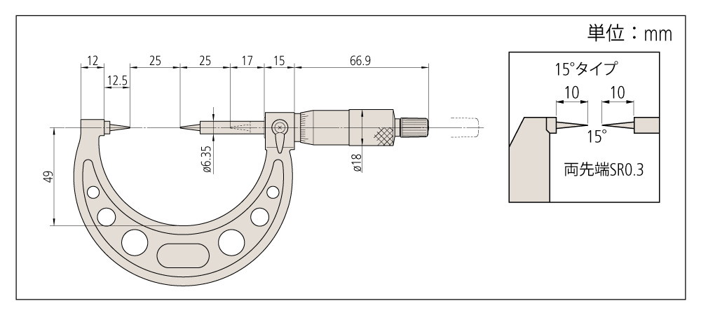 両測定面が鋭角となっており、ドリルのウェブ直径などのような谷径の測定に適したポイントマイクロメータです。