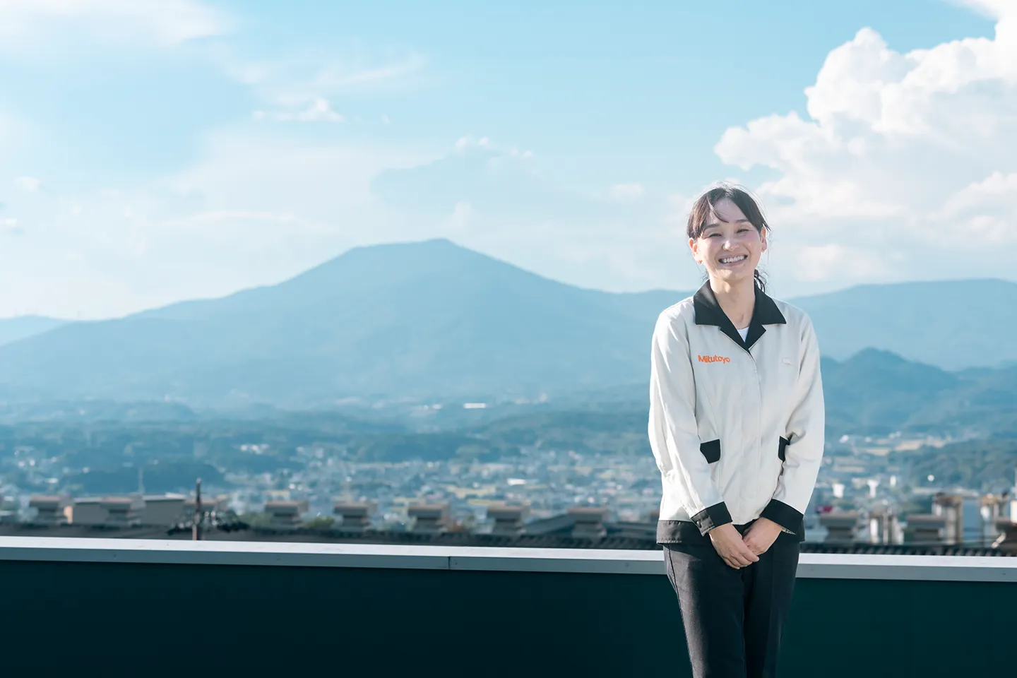 大学時代は大阪に出ていたのですが、就職のタイミングで地元の中津川に戻ってきました。 中津川工場は約200名の工場で、他のミツトヨ工場に比べると小規模。 その分、お互いの顔はだいたい知っていて、コミュニケーションがとりやすいと思いますね。 部署や担当業務を超えて、相談したり、助け合ったりすることもよくあります。 あ、もちろん他愛のない世間話もよくしています(笑)。 工場がある場所の標高は485m! 食堂テラスからは、御嶽山が一望できる自然豊かな立地で、朝は木曽根川沿いの雲海を見下ろせることもあるんですよ。 県外出身の夫は、中津川にやってきた当初、「この辺り、自然ばっかりじゃん!」なんて冗談を言っていましたが(笑)、今ではことあるごとに近くの山や川へ出向き、ドライブやキャンプを楽しんでいますね。 人と自然の魅力がぎゅっと詰まっているのが、中津川工場、そして中津川の街の特徴だと思います。
